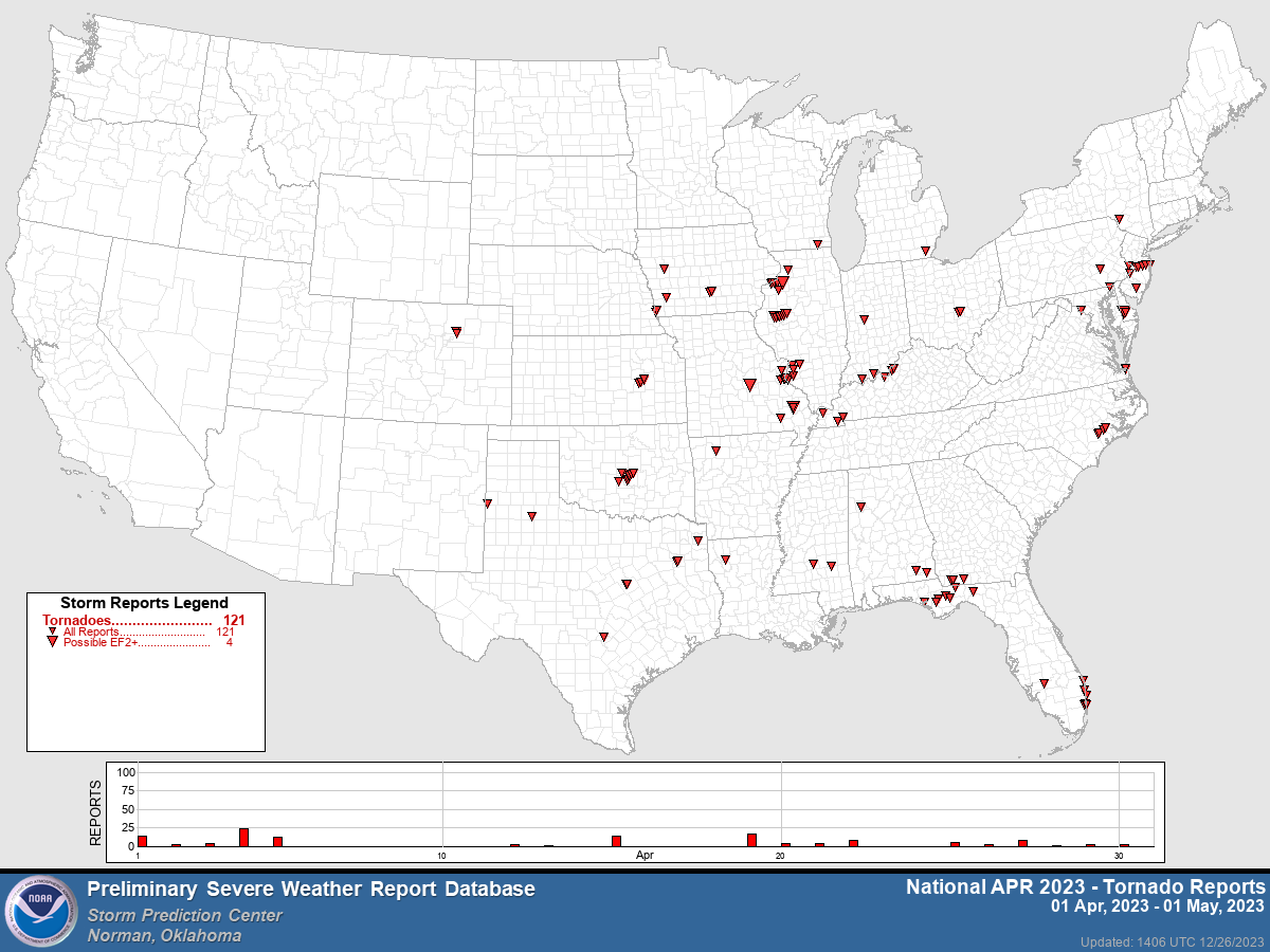 The numbers for April were half of March, with the bulk of activity occurring over the Midwest. The Plains and South were very quiet throughout much of the month — with the big and notable event on the Plains being the April 19 event in Central Oklahoma.