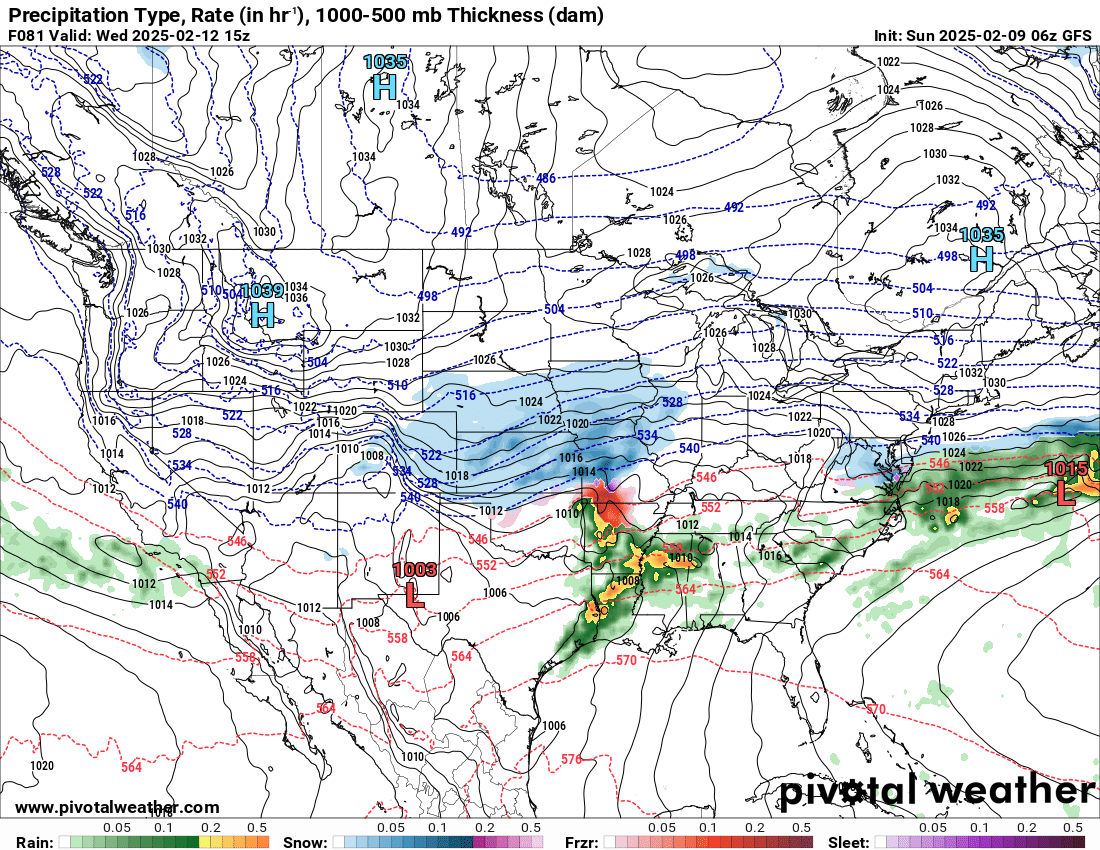 This is one model’s interpretation of the Wednesday morning precipitation situation. A broad area of snow will be ongoing across the Central Plains into the Midwest, with heavy rain to the south. There will be some embedded thunderstorms but the shear/instability combo is pretty low-end, though a severe storm or two can’t be entirely ruled out.