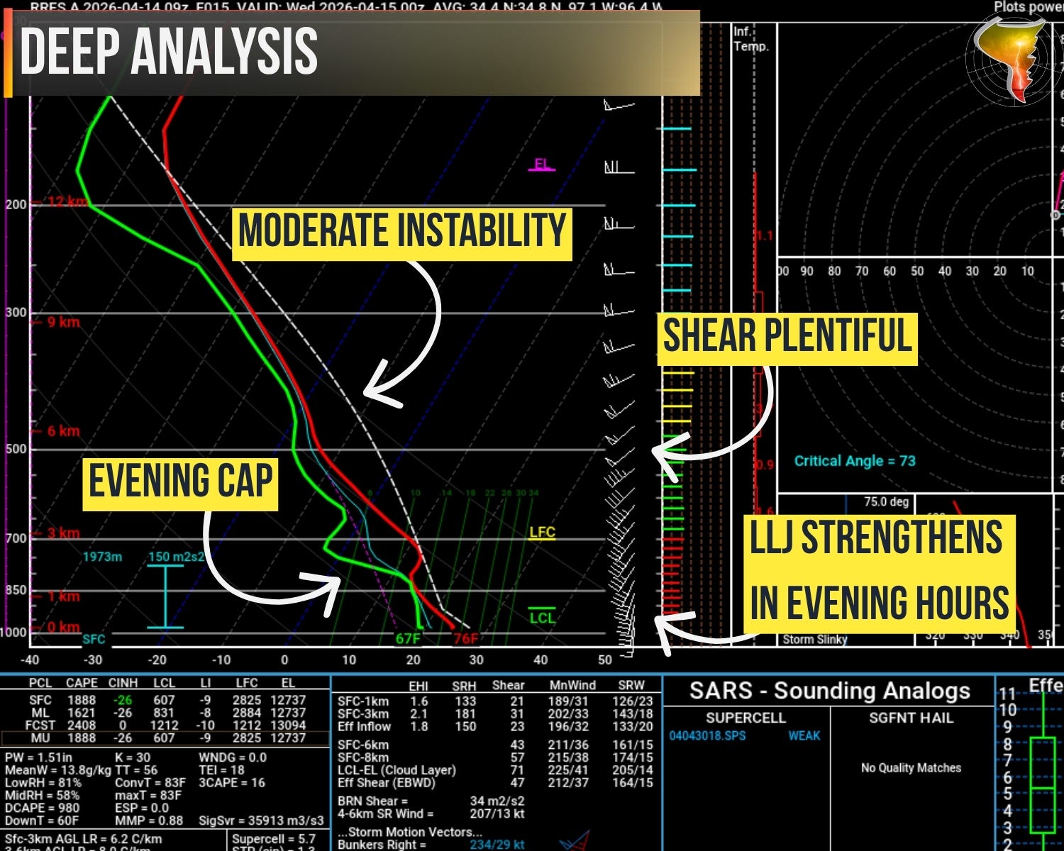 This is where it gets interesting, and where I’ll be paying the closest attention. The strength of low-level shear during the early evening remains the biggest question mark, and that’s exactly the window when the tornado risk could peak. One big key for how today goes is if a dominant supercell can separate itself from the pack. Storm interactions can help spin up tornadoes, but there’s a tipping point. Too many powerful storms firing at once and they start competing for the same air and space. It’s like putting five elite athletes on one lane of a track.