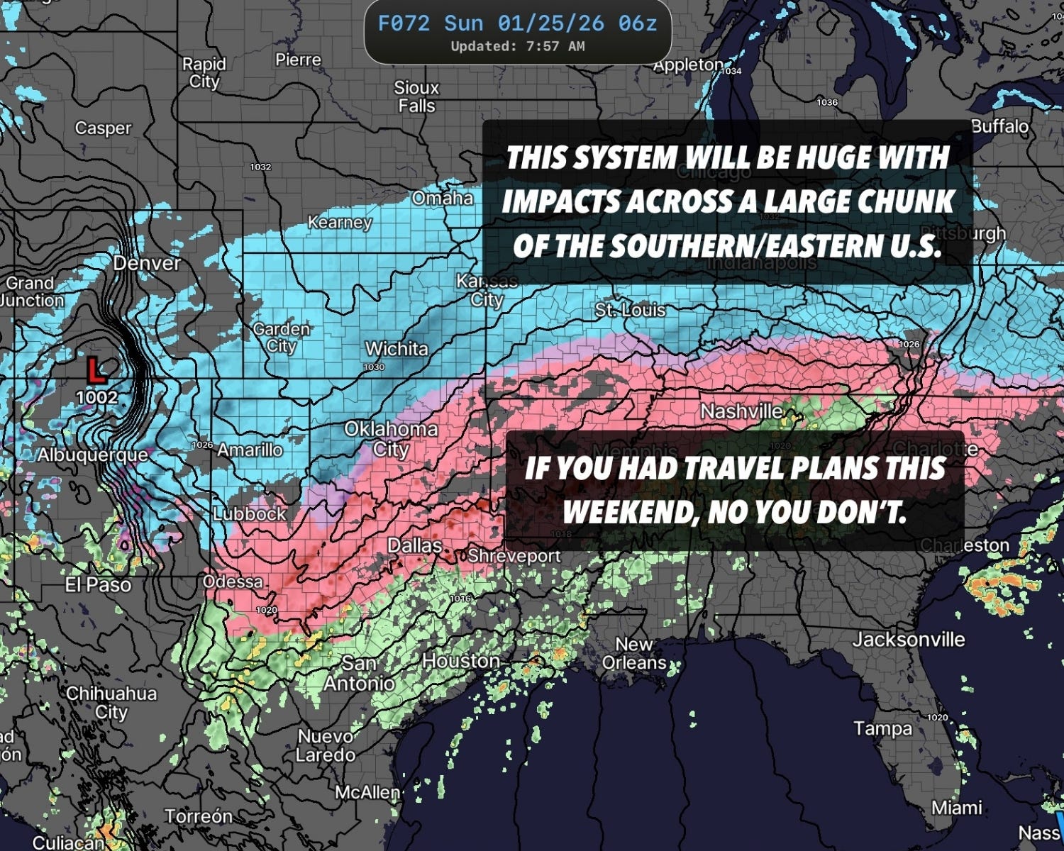 The top line is this: Irregardless of what type of precipitation falls where you are and how much, this system will create major impacts across a broad swath of the Southern/Eastern U.S.