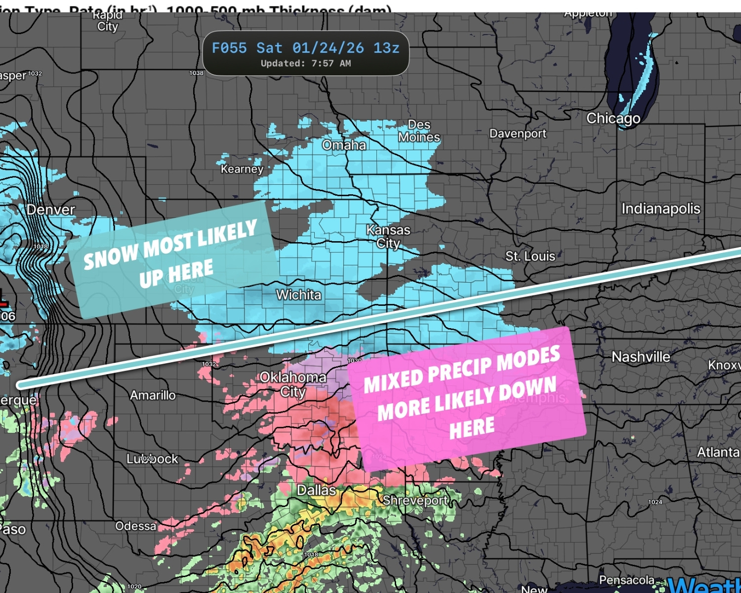 The mixed precipitation areas, which right now are south of a line from basically Albuquerque to Dalhart, TX, to Enid, OK, to Miami, OK, and then towards the Ohio River Valley region, will be difficult to pin down in terms of how much of what falls. The variability from mile to mile may actually be real in these regions — I’ve done enough of these to know that it is largely a fool's errand when you are dealing with 1°C changes in temperature, a few thousand feet up, that can change entire outcomes for a system.