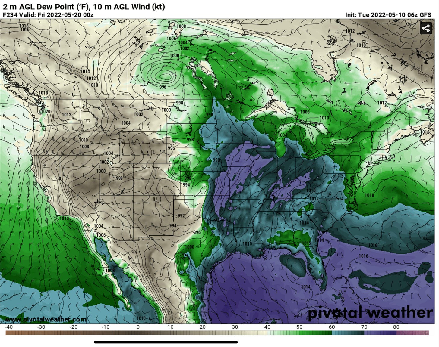 The relentless troughing pattern we’ve grown used to is going to give way to a much more stale pattern over the country, with a low pressure system centered over the western U.S. becoming blocked and lifting north over the coming days. A retrograding low in the Gulf will limit moisture quality over the middle of the country this next week, resulting in a pretty meager environment by May standards for severe weather.