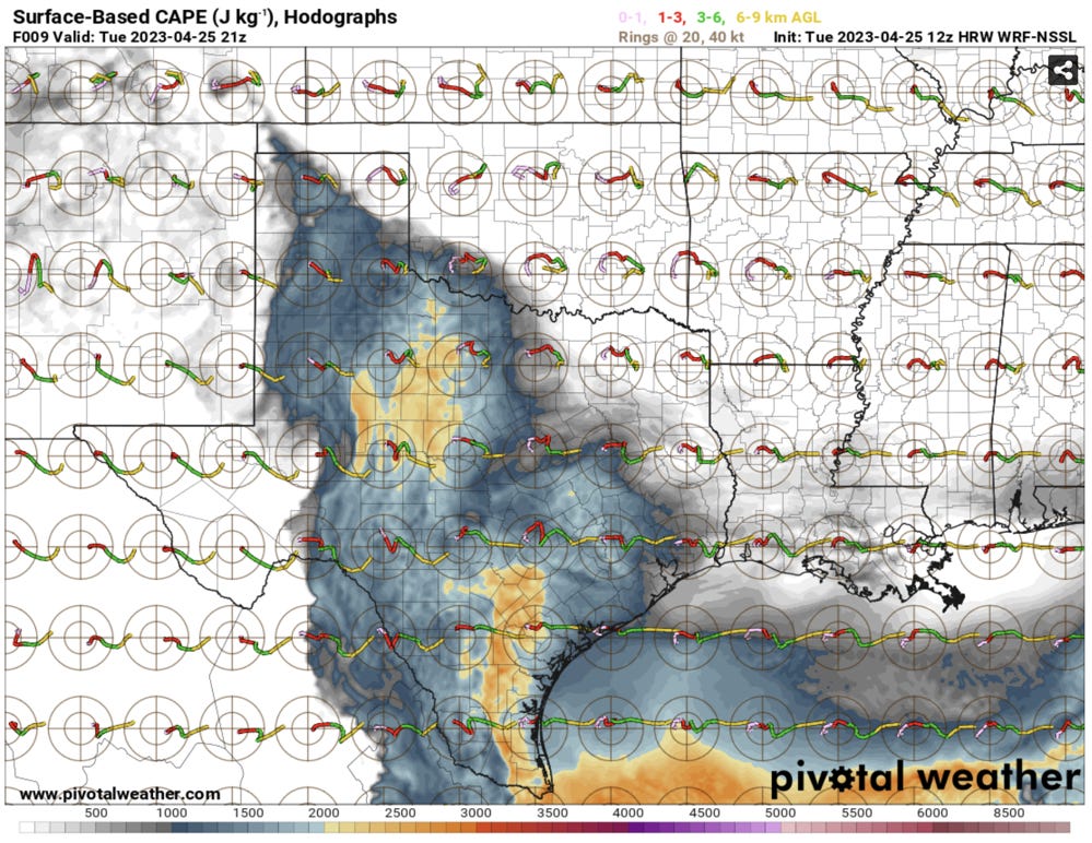 In time, there will be more curvature introduced into the hodograph towards sunset. This will make supercells a bit more robust with prehaps a bit of solid structure nearer to sunset. However, the cooler surface temperatures and weak instability may modulate the structure show a bit for storm chasers.