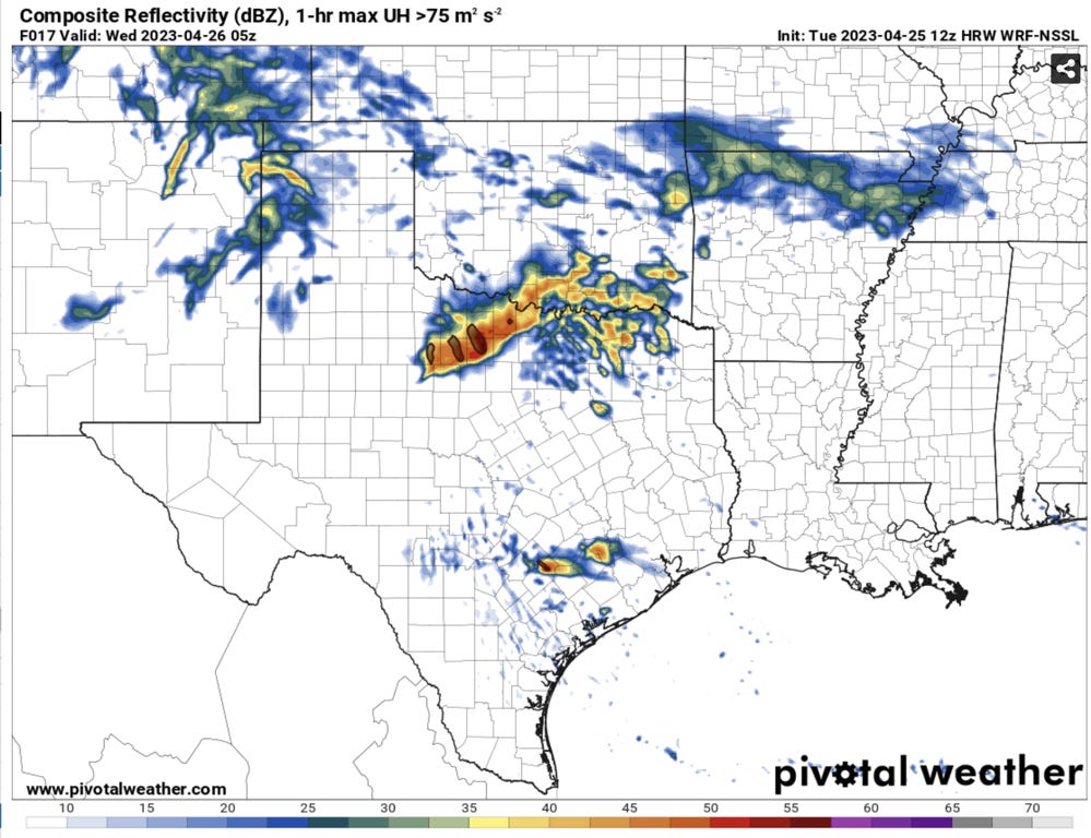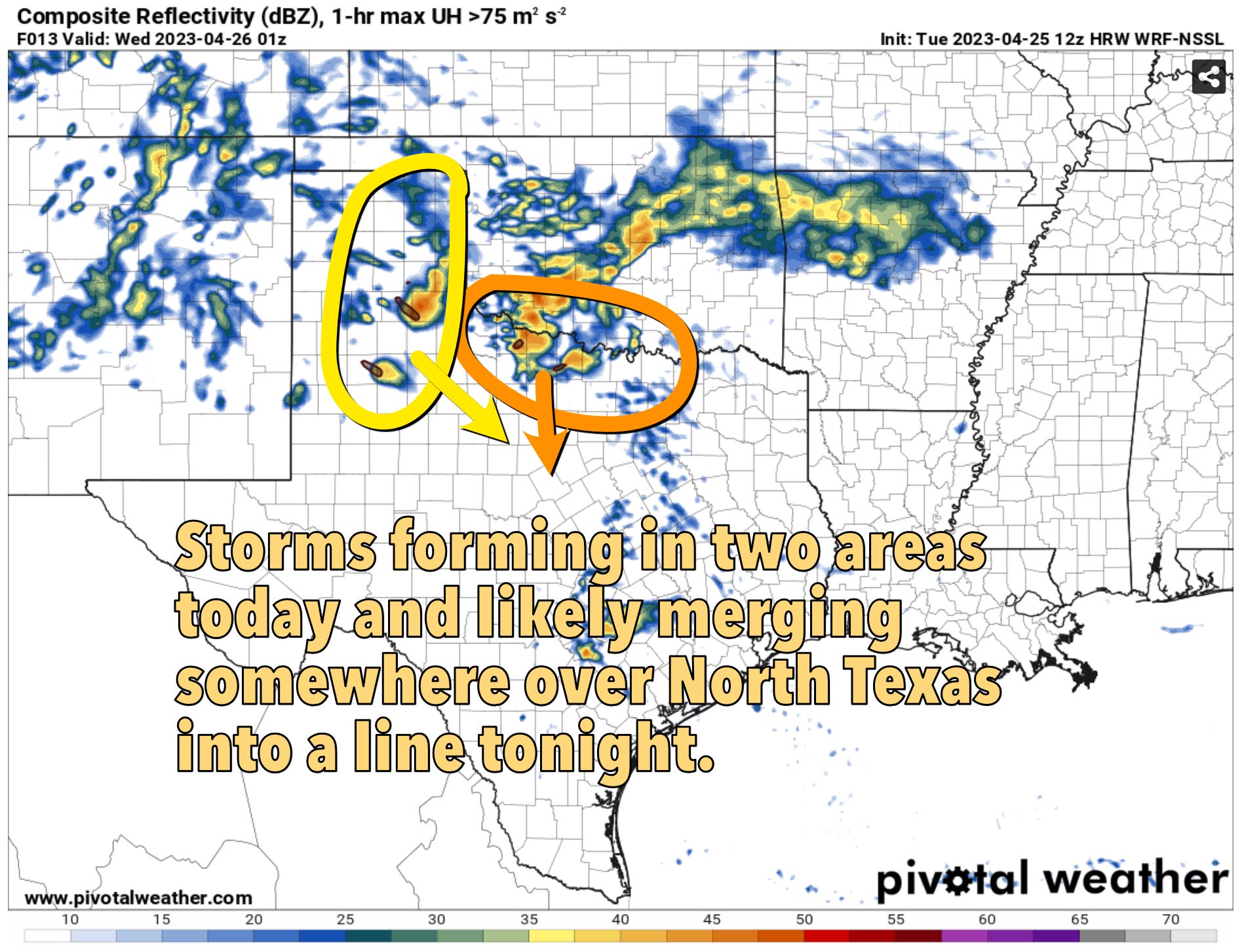 Today isn’t a huge day on the surface, but a couple of supercells will likely merge with a growing cluster as a linear complex tonight and sweep south and east, possibly right across the DFW metroplex. Large hail will be the biggest threat initially, but damaging winds and a tornado or two could become threats with time overnight.
