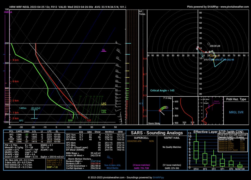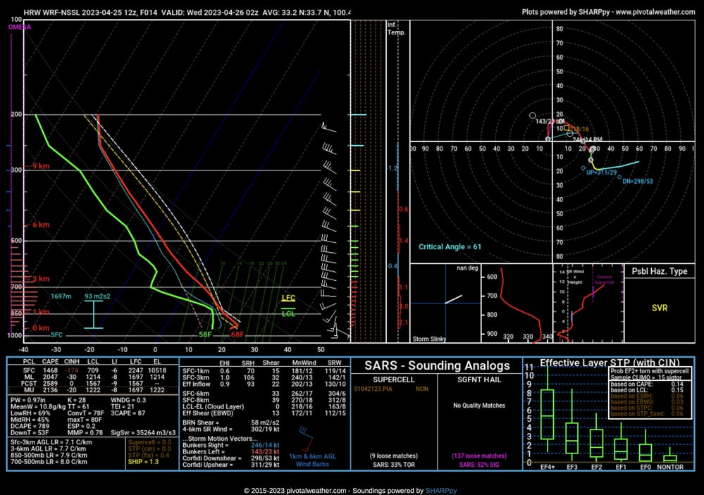 Initial wind shear values are very poor if you are looking for robust supercells. While the 0-6km bulk shear numbers are 39, the overall SRH values leave much to be desired. If you do get supercells, they likely wouldn’t be that impressive initially.