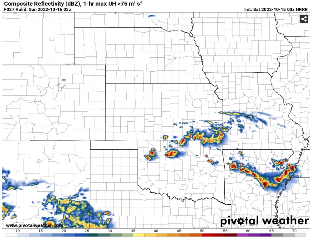 Almost entirely nocturnal threat: Most high-res models show very little confidence in storm initiation before dark across much of the area. The best chance for storms in the daytime will be east-central Oklahoma into Arkansas.