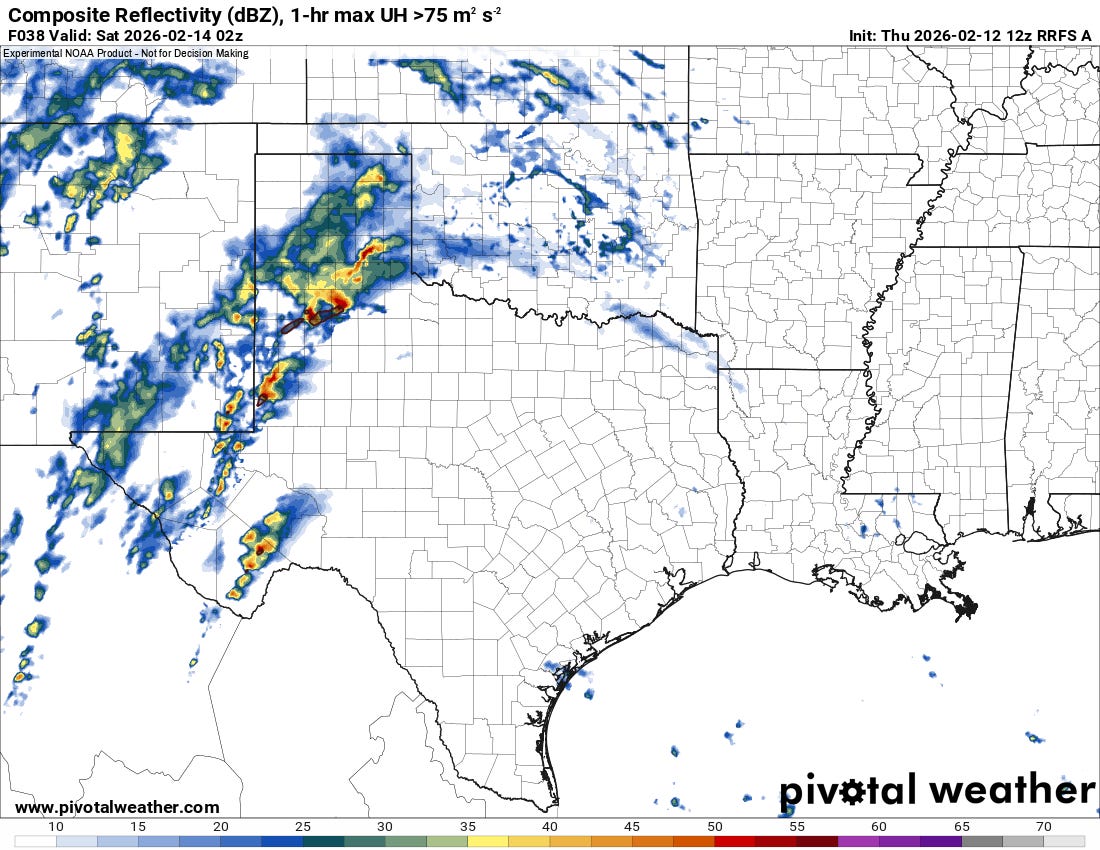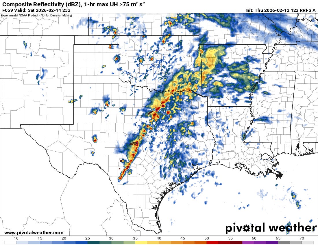 Storms should be ongoing throughout much of the day on Saturday with a linear system taking shape over Texas into SE OK.