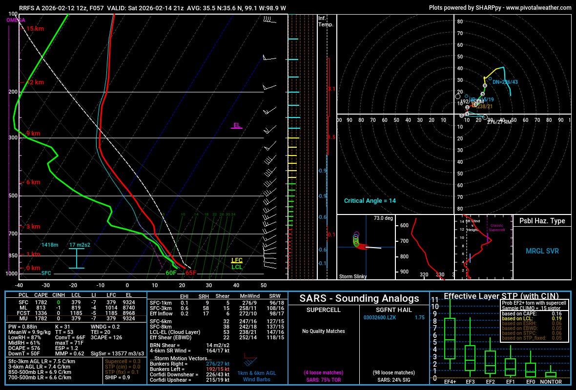 However, underneath the low over W/NW Oklahoma there’s A LOT of 3CAPE showing up on models with scattered storms. With a cold-core-like setup here, I wouldn’t rule out the atmosphere given the vorticity and stretching near a low. Never say never when this combo comes to town — I think a lot will ride on there being a lot more surface heating. But this will be something to watch in the coming 24 hours.