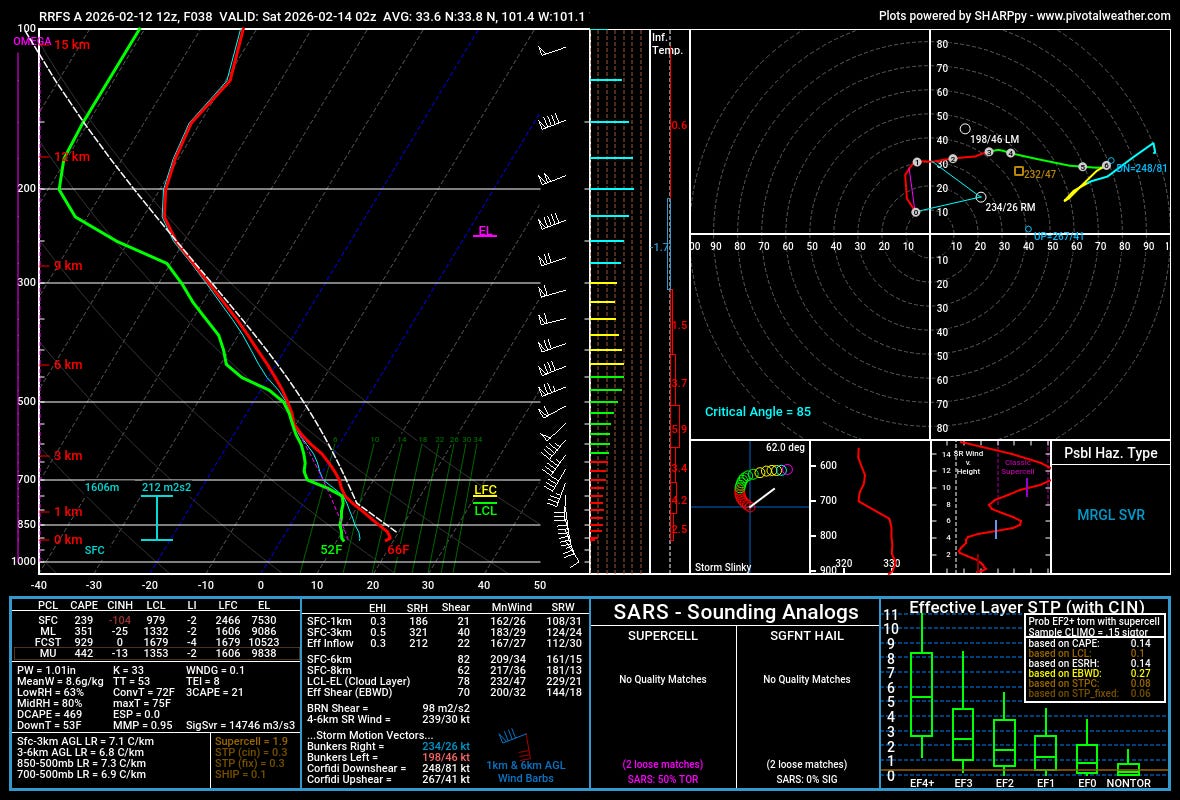 We likely won’t see a lot of damaging wind reports, but the storms will not be elevated above the surface layer fully, so it wouldn’t be surprising to see some blue dots on the map as we move into the morning hours on Saturday. Another thing to watch is that, despite the modest low-level moisture, there is a lot of shear in the lowest levels. I don’t think a tornado risk is really warranted, but stranger things have happened.