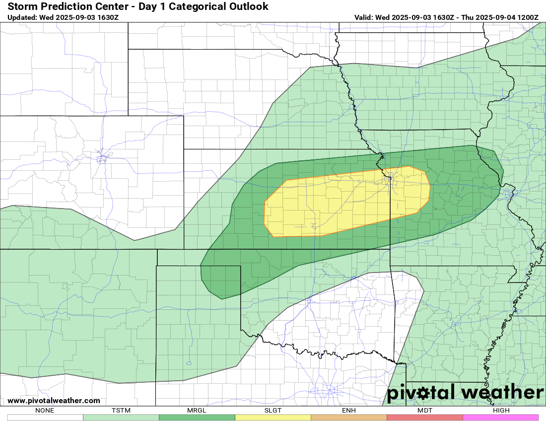 The Storm Prediction Center has outlined a slight risk zone across parts of Kansas and into Missouri. There is also a marginal risk zone stretching into Oklahoma and the Texas Panhandle as well.