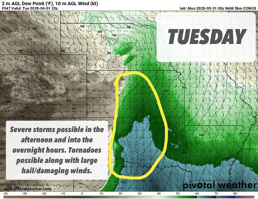 Oh yes, this week will be busy with tornadoes possible on both Tuesday and Wednesday. Another system is coming in on that one’s heels that will bring cooler/rainier weather to the Plains. Let’s dive in.