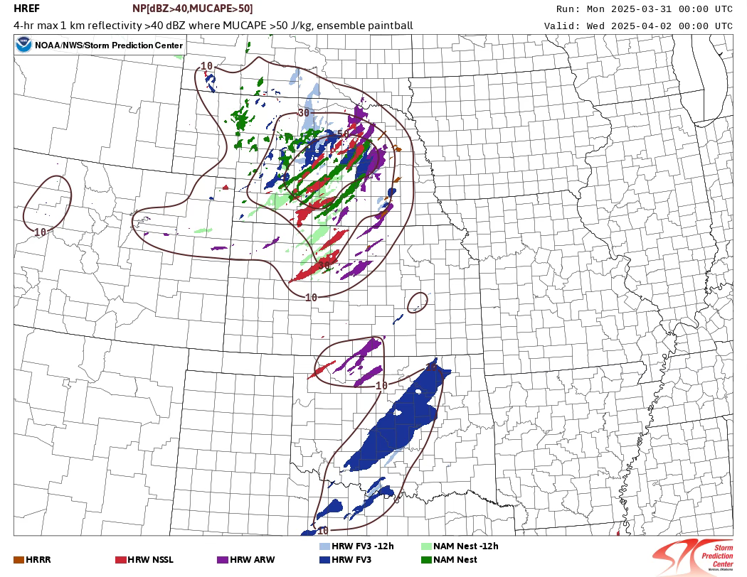 The HREF guides the way, with a look at storm initiation probabilities across the region showing potential from Nebraska to Texas. We will be keeping an eye on the possibility of storms initiating further south down the dryline into Southern Oklahoma, where better moisture return is noted on models.