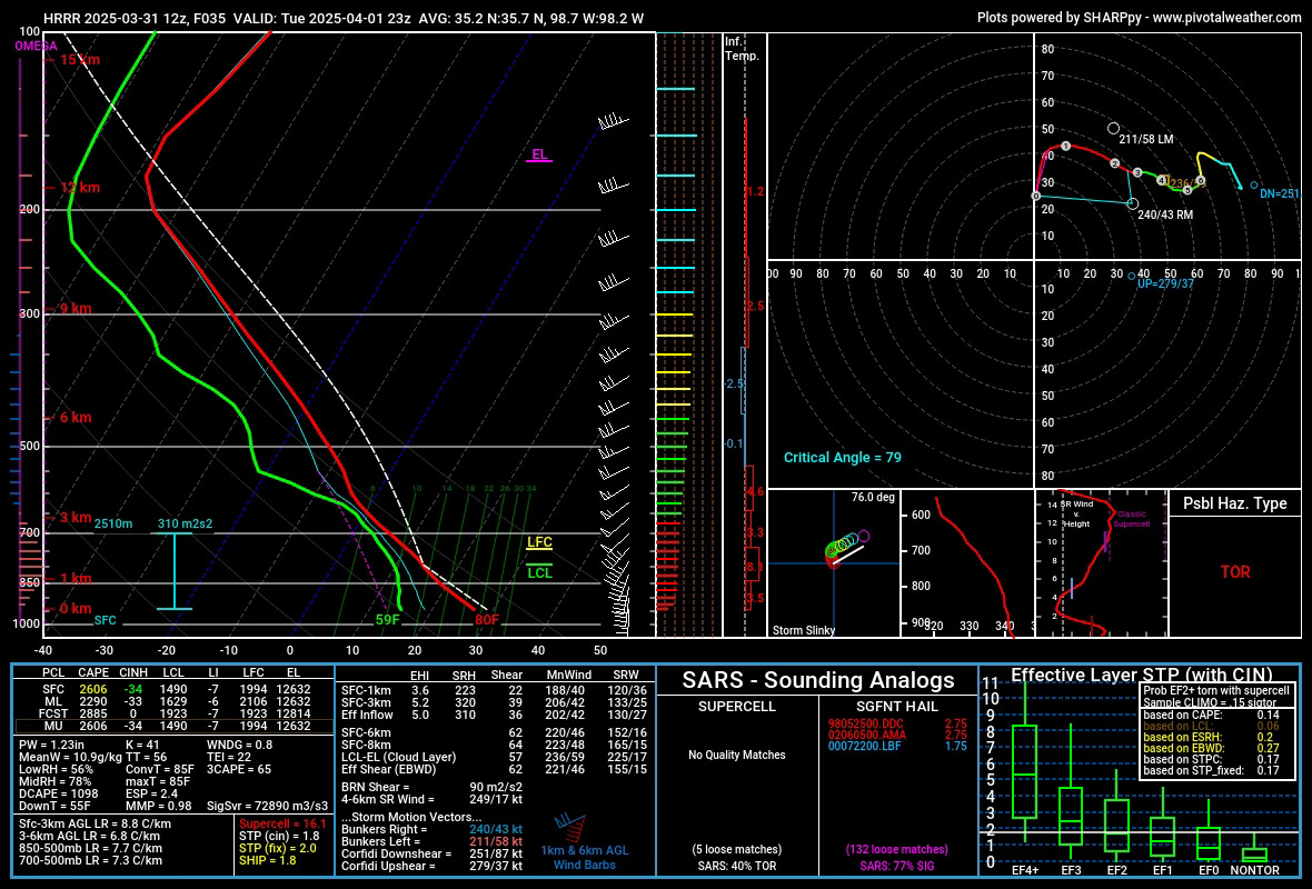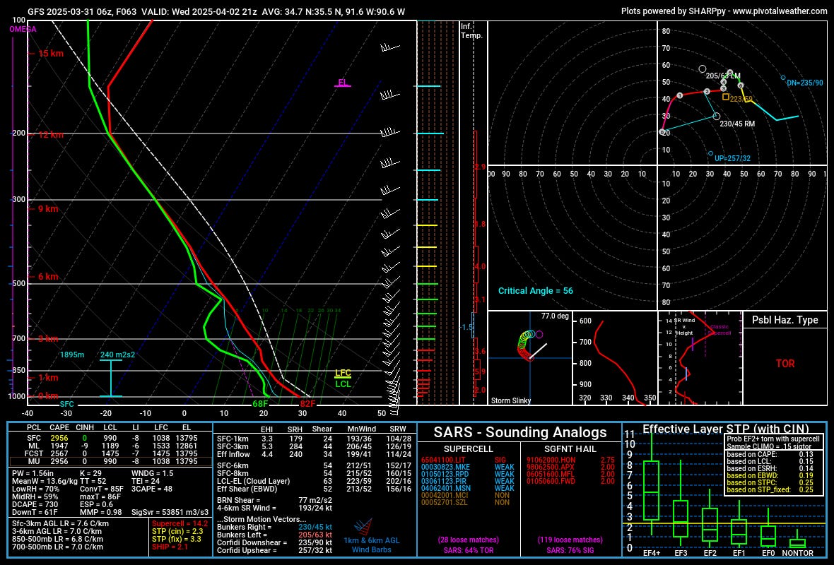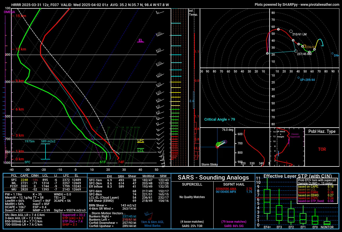 A forecast sounding on the HRRR shows a lack of inhibition by the near sunset hour coupled with very favorable shear profiles. The 0-1km helicity of 223, along with critical angles at/near 80°, all show the potential for rotating storms. Additionally, strong 3CAPE values and an overall MLCAPE of over 2000 j/kg give this event the feel of a later-in-season offering. The negative omegas aloft give me some pause about storm formation, but I haven’t seen that consistent signal across models.