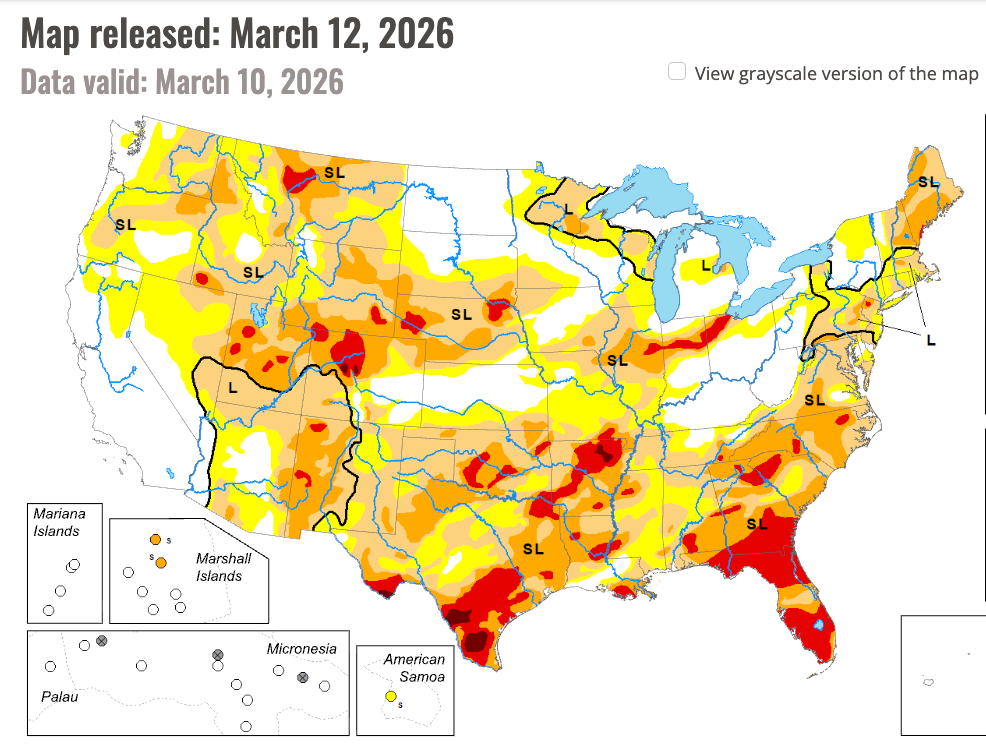 The Drought. D2 through D4 drought covers nearly the entire southern Plains, Gulf States, and Deep South. CPC’s seasonal drought outlook shows it persisting through at least the end of April. Dry soils mean less evapotranspiration, which means the boundary layer becomes almost entirely dependent on direct Gulf moisture return, which is a bigger (but not impossible) ask. With the hot/dry air over the high terrain of New Mexico up through Montana, the direct result becomes strong capping (which we’ve already seen), steep lapse rates (again yep), and an atmosphere that produces several ‘loaded gun’ setups throughout the Spring.