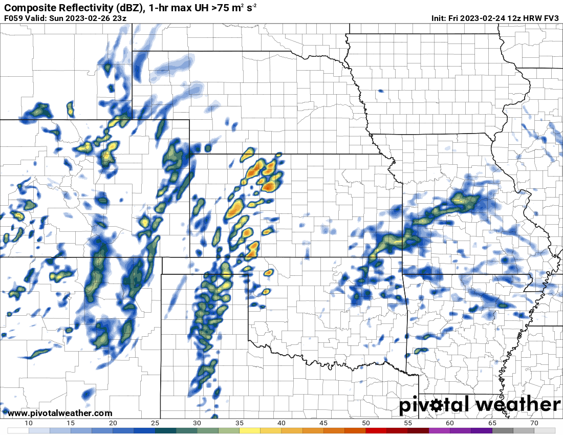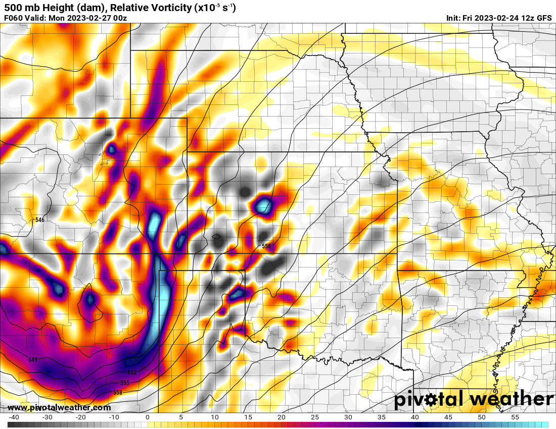 The amount of forcing quickly ejecting over an unstable airmass is impressive on Sunday. The system quickly ramps up lift after mid afternoon and towards sunset. Depending on cap strength and moisture return, we’ll see storms form around 4 p.m. on Sunday give or take an hour or two.