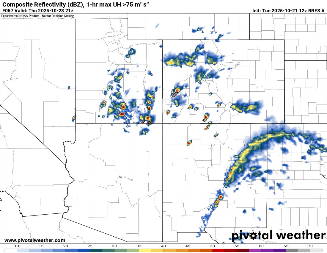 The first sign of trouble, at least when it comes to generating ample instability, is how this low touches off thunderstorms in low 40 dewpoints that even present updraft helicity tracks on the RRFS model Thursday afternoon in the Four Corners region. This area has been a hotbed of severe weather and even tornado activity this fall. The divergent flow aloft with cool temps aloft makes this a plausible possibility.