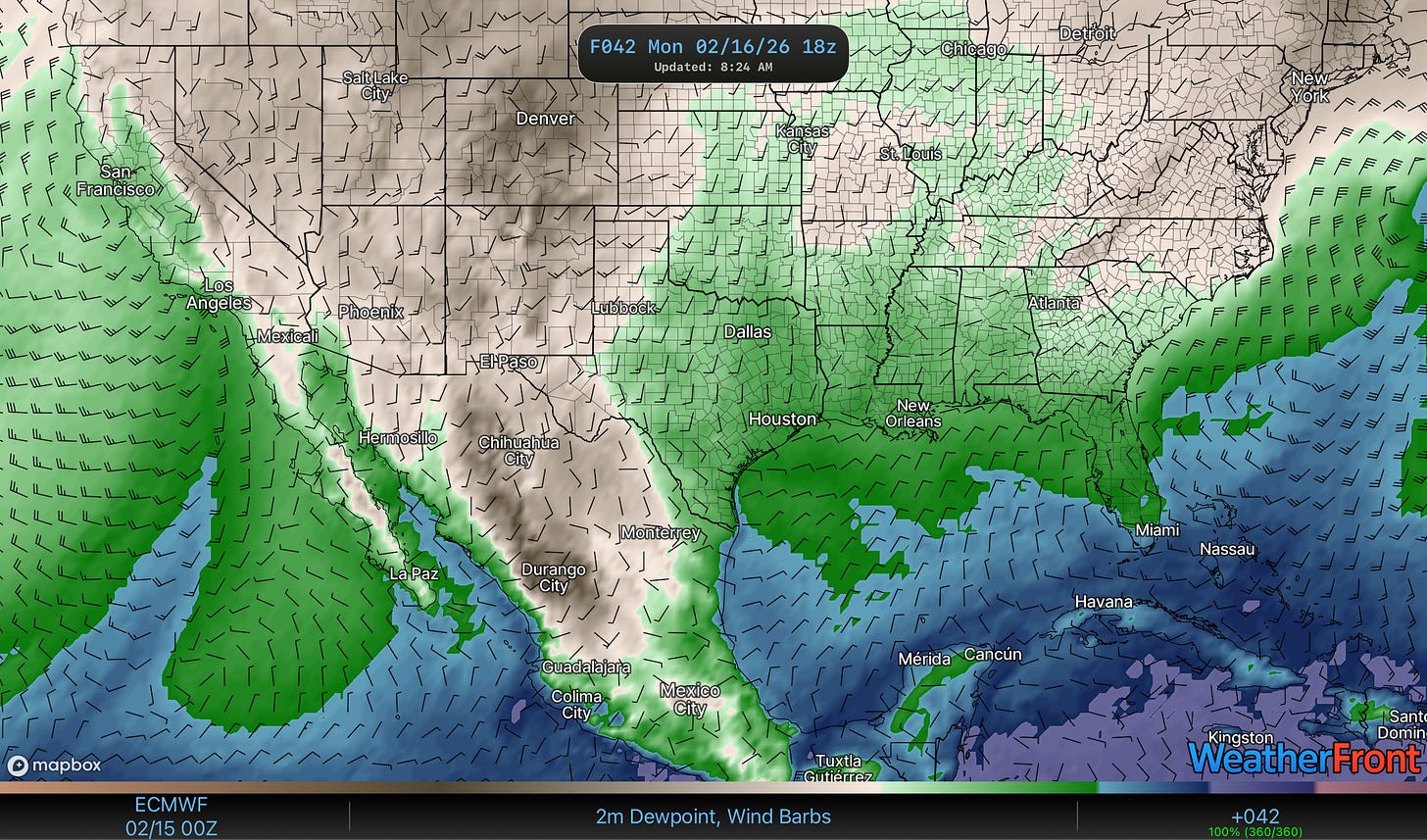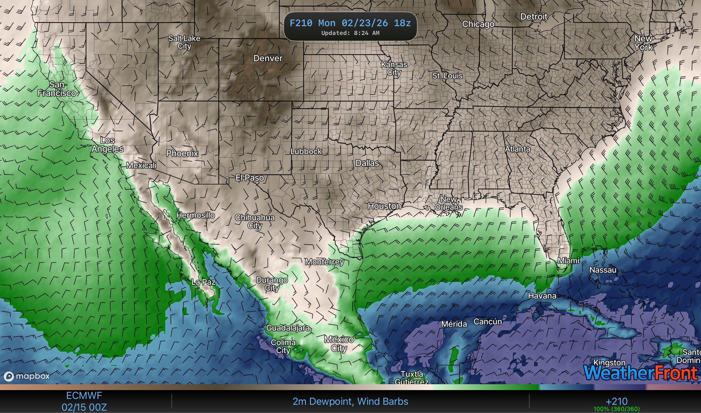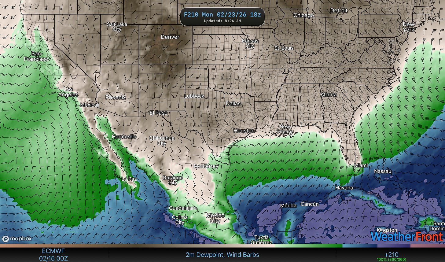 The current front pushing south will go all the way through the Gulf of Mexico and into the Caribbean. You can see the atmosphere in this image is already trying to funnel moisture northwards ahead of another wave by Monday — but there’s nothing to tap in to.