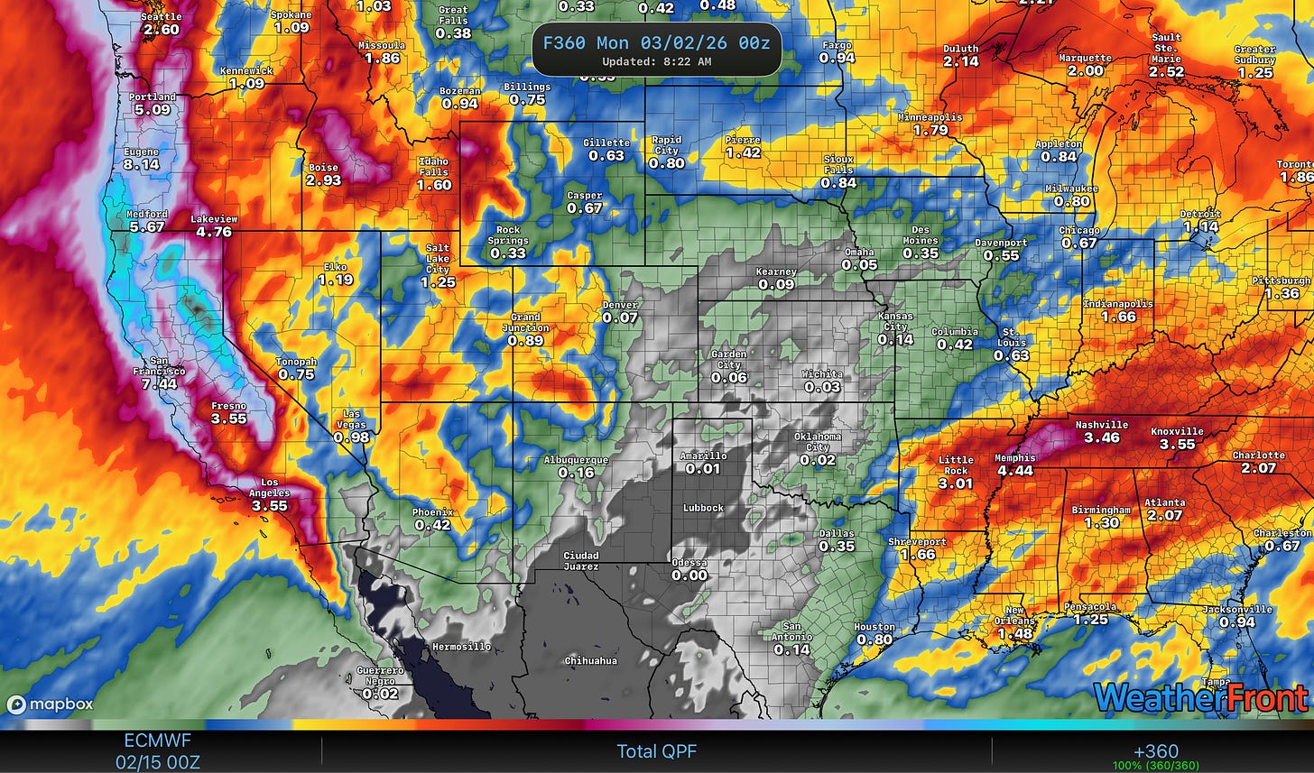 Sensibly that type of pattern results in this. A wetter west thanks to pacific moisture plumes (ski resorts may finally get real snow out there!), and dry Plains, and a wetter eastern U.S. It’s not impossible we’ll see a few severe weather risks out of this pattern in the South — but the intense moisture buildup that precedes big winter severe weather outbreak days doesn’t seem to be in the offing just yet.